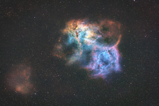 Wide field image of Sh2-132 Lion Nebula in OSH Hubble Palette, captured with ASKAR E1 and ASKAR E2 ultra narrow dual band filters.