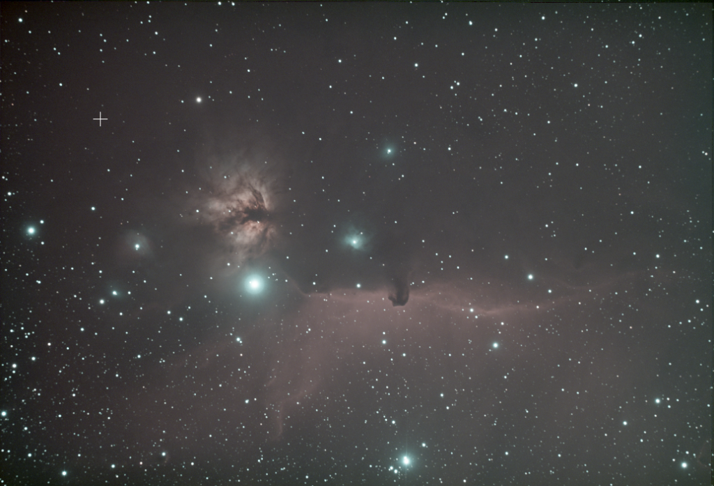 In the photograph, the Flame appears as an extremely complex structure: the bright, jagged central core, the dark dust filaments standing out like black fissures, the more diffuse peripheral regions, where the emission is weaker and fades into the background sky.